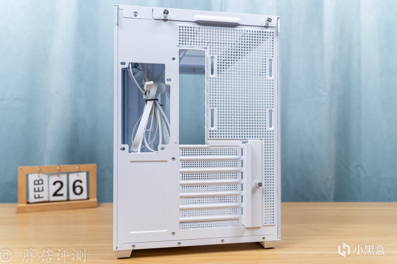 ▼机箱背面,是一整块的金属背板,中间是超大面积的金属冲孔网。