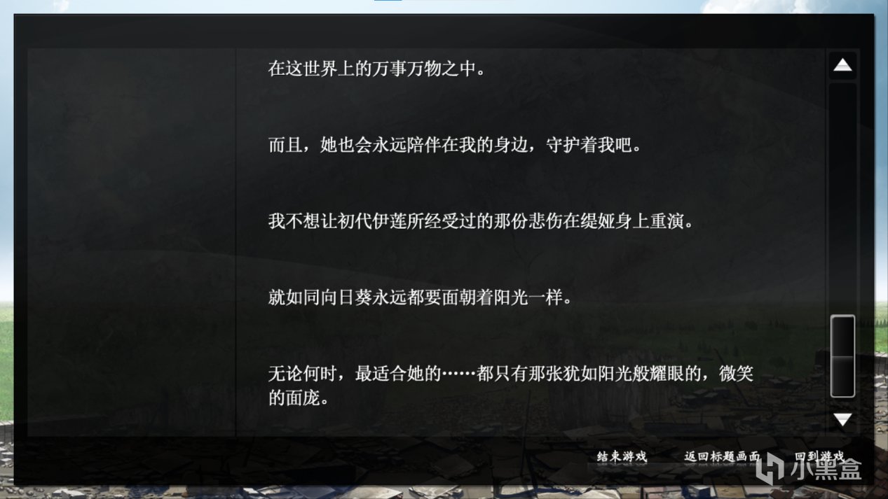 故事到这里也就到达了尾声,本作的结局是一个在我心中是个意料之中且富有浪漫主义的悲剧式结尾,尽管对于男主来说,满眼都是悲剧色彩,但在于悲剧同时,恢复生机的大陆,百废待兴的城镇,握手言和的民众,一切也都蕴藏着真切的希望,面对这美好的景象,男主也必然会努力将这个世界变成美好的模样,哪怕是为了心爱之人最后的笑颜,这回应了游戏对于“生存的意义”这一主题的探讨————“怀抱自己的理想与信念,选择自己无悔的前行之路,哪怕是与命运抗争到底”。
