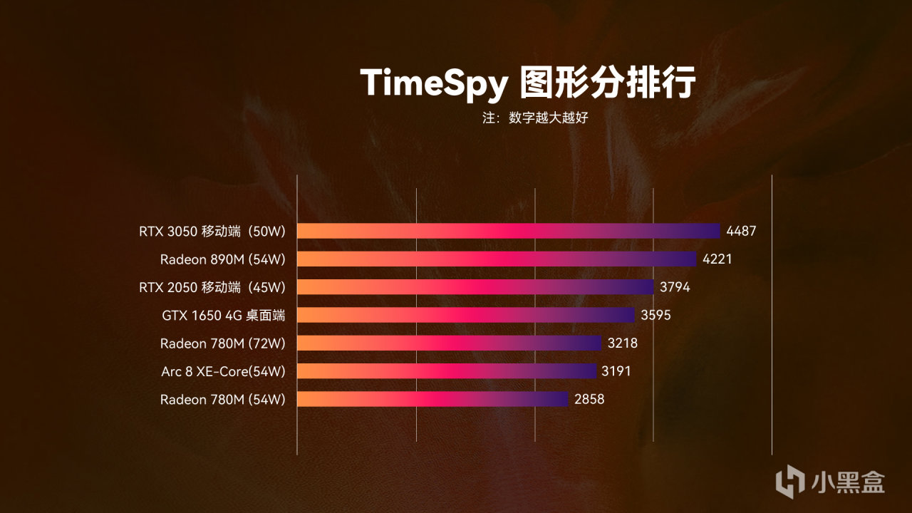 而國內一家做遊戲掌機的GPD,也是毫不吝嗇的公佈了Radeon 890M的TimeSpy跑分,從圖中可見,新一代的 890M相較於上一代780M,在相同功耗下性能提升約爲32%,而面對與72W功耗也毫不示弱,性能也有23%的提升,更甚至超過Steam硬件排行榜第二的GTX 1650,面對着RTX 3050移動端也就僅有6%的差距。