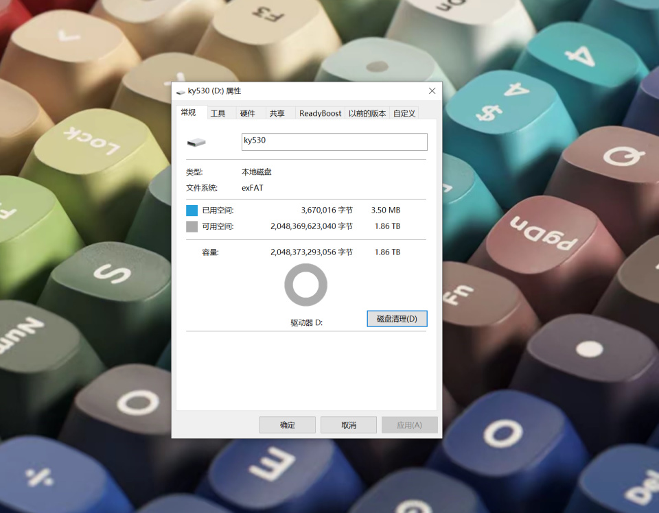 分區後可以看到新的盤符ky530,硬盤總大小1.86TB,剩餘空間1.86TB。