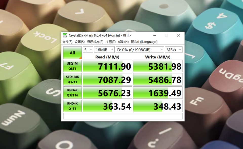 希捷酷魚530官方標稱順序讀取速度高達7400MB/s,妥妥的PCIe4.0旗艦水準。使用專業的硬盤測試軟件CrystalDiskMark測試後,順序讀取速度7111.9MB/s,寫入速度5381.98MB/s,表現非常不錯。