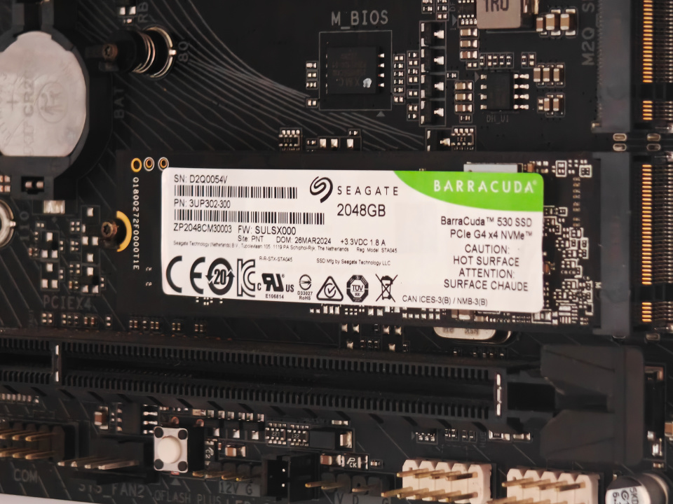 我的主板爲技嘉的Z790m,總共有3個固態硬盤插槽,配備了M.2散熱裝甲,支持技嘉一鍵內存超頻黑科技。固態硬盤安裝非常簡單,我們將希捷酷魚530插入固態硬盤插槽,將硬盤按下並旋轉小卡扣即可。