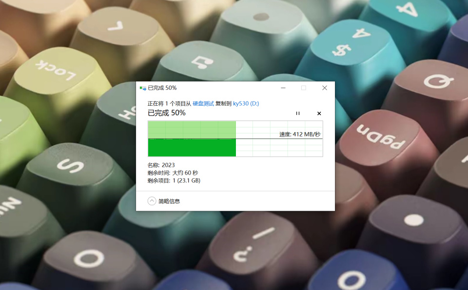 爲了測試希捷酷魚530固態硬盤的工作穩定性,我們從外置固態硬盤拷貝一個大文件到酷魚530,大家看下圖,其寫入速度曲線基本持平,沒有忽高忽低,不掉速纔是好硬盤。寫入速度穩定在412MB/秒,已經達到外置固態硬盤最大讀取速度。