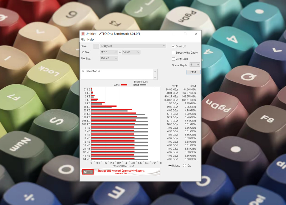 使用ATTO Disk Benchmark進行測試,隨着測試數據慢慢增大,讀寫速度越來越快,最後讀取速度穩定在6.53GB/s。
