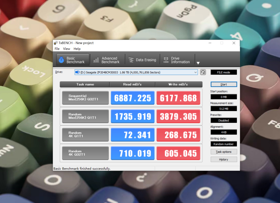 使用TxBENCH進行測試,順序讀取速度6887.225MB/s,寫入速度6177.868MB/s。