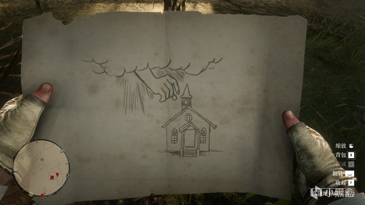 根据第一张藏宝图可以看出这是一个教堂,天空中一只上帝之手伸向了教堂顶部。