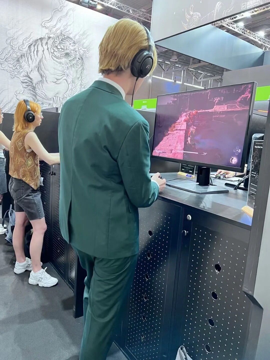 一對情侶,雙雙通關了黑神話試玩的所有BOSS,他們兩人於九年前在科隆遊戲展認識,同時也獲得了新的“情侶裝”黑猴官方T恤。