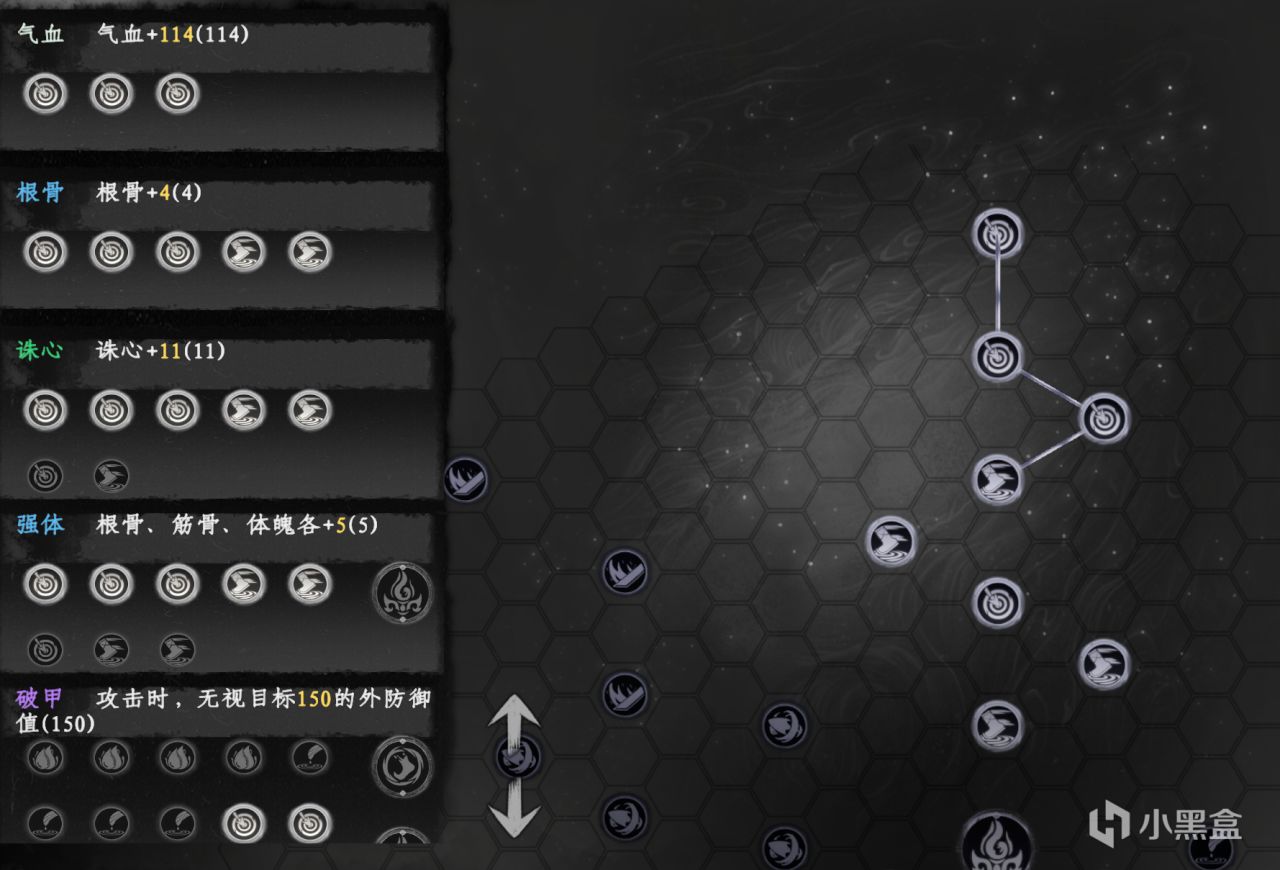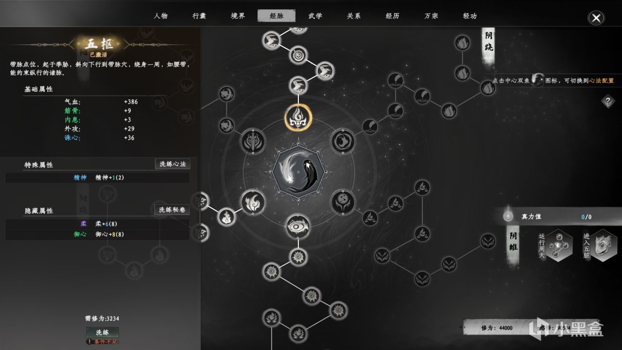 不过为了境界突破所需要的属性,我是比较建议先打通南北端的气冲和五枢(分别提供大量的精骨和内息值)。