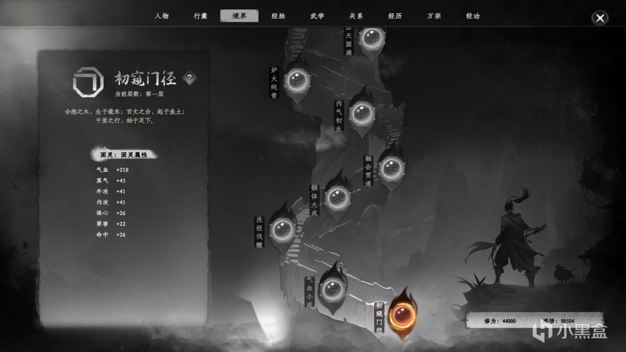 我们养成角色的第一步是“境界”,这个过程有点像是修仙游戏中常见的“金丹、元婴”那样的设定,而《下一站江湖Ⅱ》境界的突破需要的是对应的灵丹、打通的经脉条数和对应的属性值,也正如修仙游戏一般,境界突破如果你选择更稀有的丹药,可以达成更强大的突破效果——这也为游戏带来了很好的重复可玩性(虽然一周目的可玩时长已经非常的惊人了)。