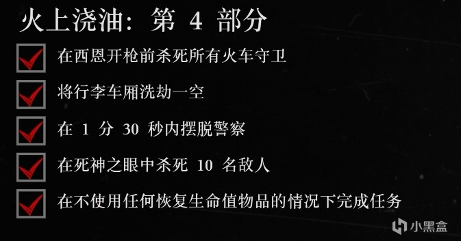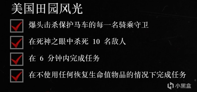 注意事項:上火車流程是先幫約翰搶劫兩個車廂的乘客,然後約翰會叫我們去後面幫助西恩。這時候走到西恩附近會提示解鎖手動死眼,提示出現後準備好會有一個守衛偷襲西恩,立刻開啓死眼擊殺,車廂頂上會出現第二個,隨後車廂裏面會出現兩個。一個四個敵人,全部死眼擊殺後完成第一項挑戰。
