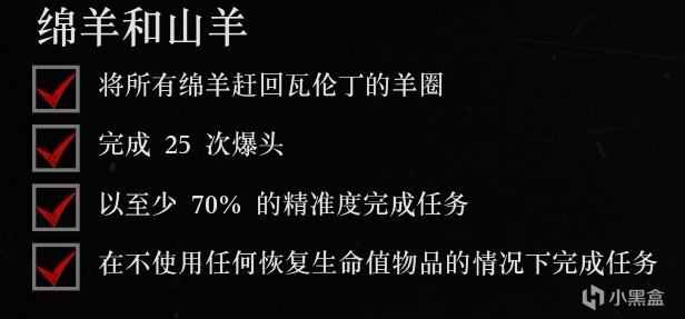 注意事項:放羊的時候不要跑太快,讓馬慢慢走在羊羣后方便於控制方向,沒有開槍趕羊的必要。距離遠了就小跑,不遠就慢慢跟着羊羣。第一項挑戰完成後的部分只需要注意好及時補充死神之眼即可。
