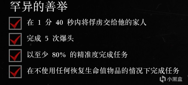 注意事項:難度不高,靠近德國人鬆綁就會出現敵人,此時躲在掩體後利用標記死神之眼完成挑戰即可。送德國人回到家人身邊只需要儘可能走直線,避讓障礙物。在1分40秒內送達不是很難,但是按路線走還是有可能會超時。