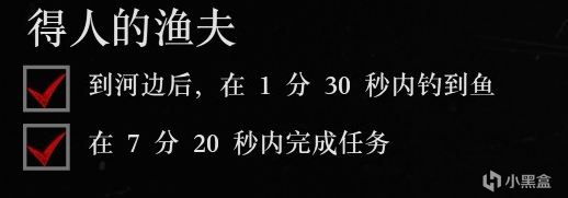 注意事項:到河邊後不用管系統提示,直接走到黃標提示位置釣魚。只要第一杆不空就很容易完成。一般釣到三條魚就可以觸發動畫了。離開時別把傑克拋下,傑克上馬後儘可能直線趕回營地即可完成,注意地形不要摔倒。