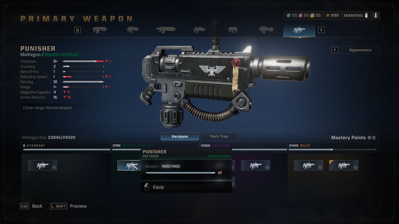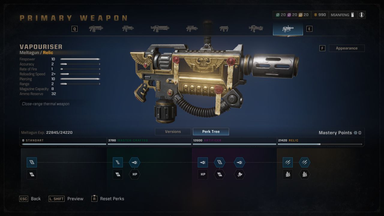 每把武器都有独特的“技能树”,需要资源“大师点”进行升级,一般有两条技能线,有些技能点处有分支,可以切换到另一条技能线继续加点。值得一提的是增加的数值较多,常驻增伤为5%,条件增伤则在10%-25%不等,还有一些增加射程、稳定性、弹匣、备弹、减少护甲恢复时间、针对敌人类型增伤的技能点等等。