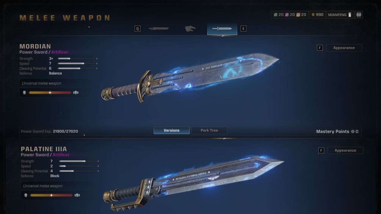 每把武器都有6~8种变体,变体之间区别较大,也决定了不同流派玩法的基础,例如动力剑“史诗”品质的两把武器差别就较大,第一把速度、劈裂(cleaving potential)属性更高,也就更适合打潮,第二把伤害更高,就更适合击杀精英敌人,再根据技能树进行perk加点,构筑不同玩法。