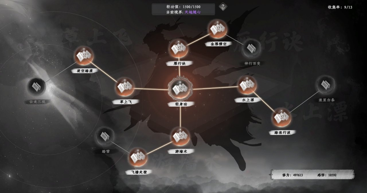 點開輕功全部學習後,將所有的輕功都提升至化境(最高境界),提升至最高級非常重要,比如輕身功最高級時cd會大大減少,在前期,這個技能就相當於閃避,有無敵幀,戰鬥中很重要。