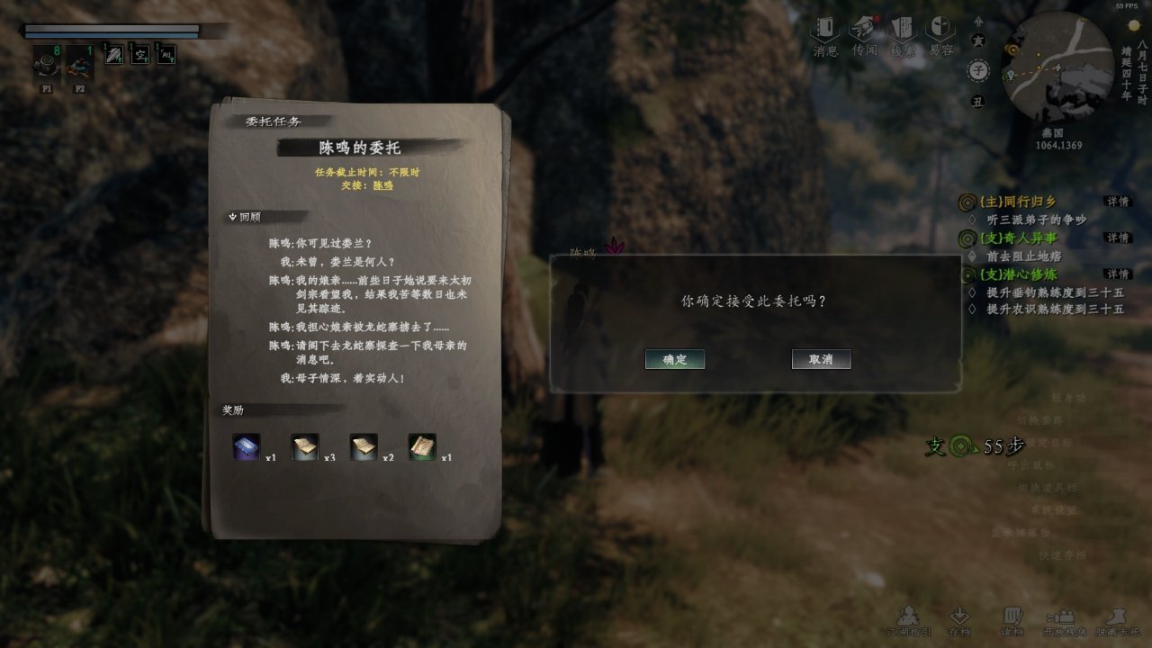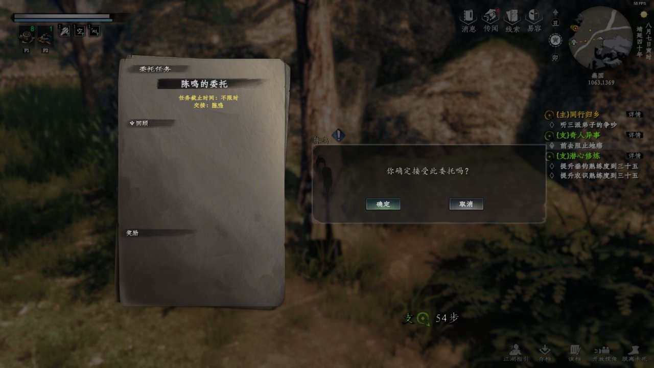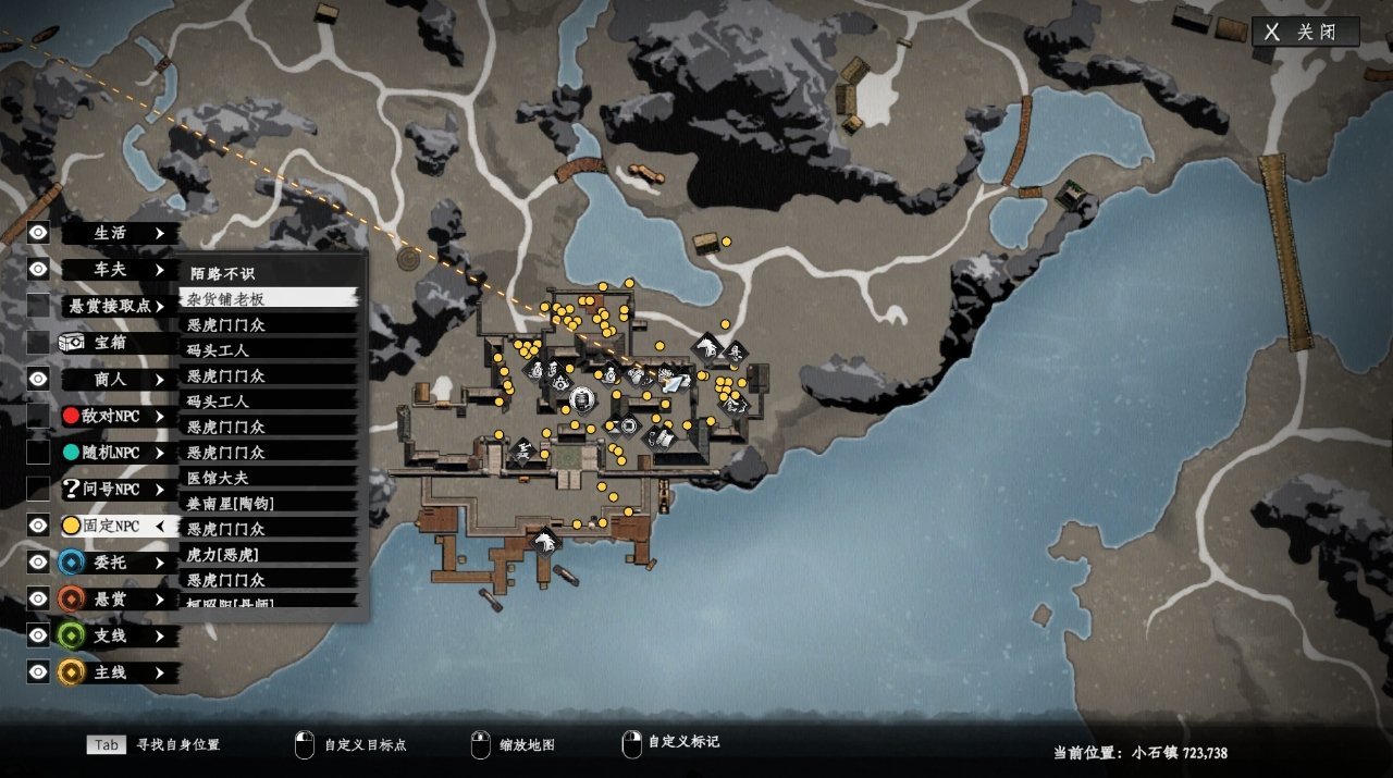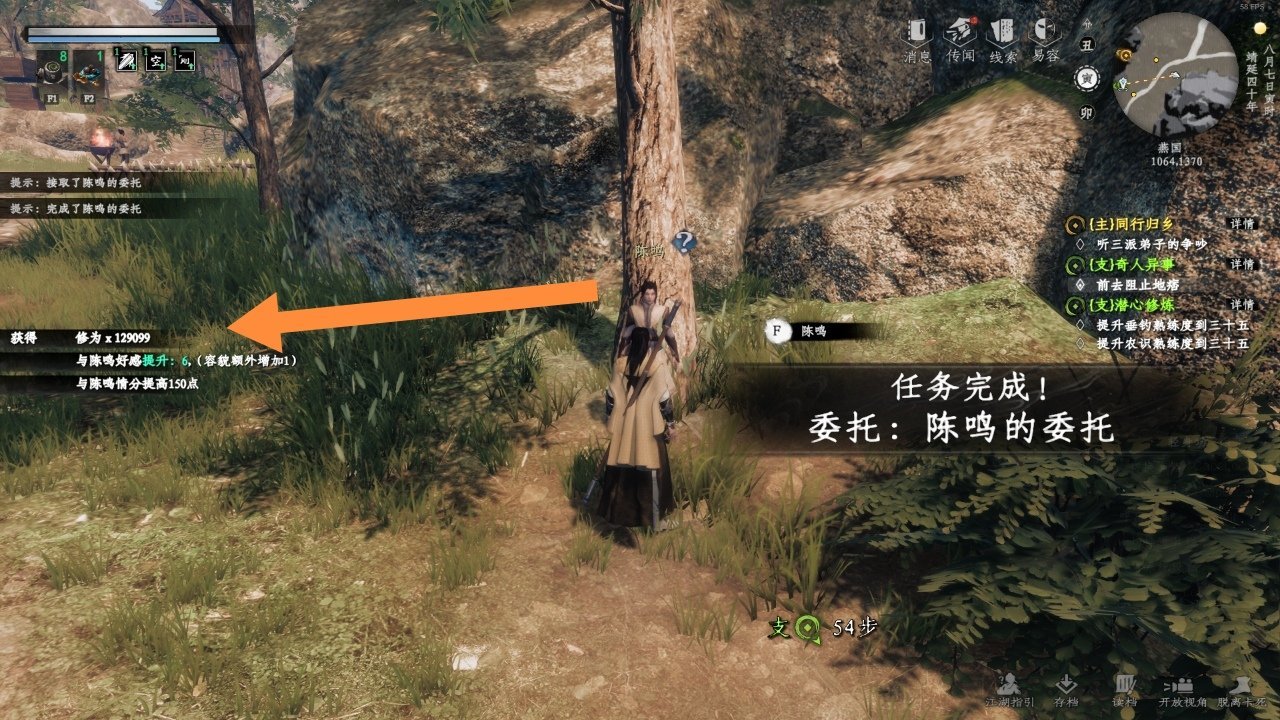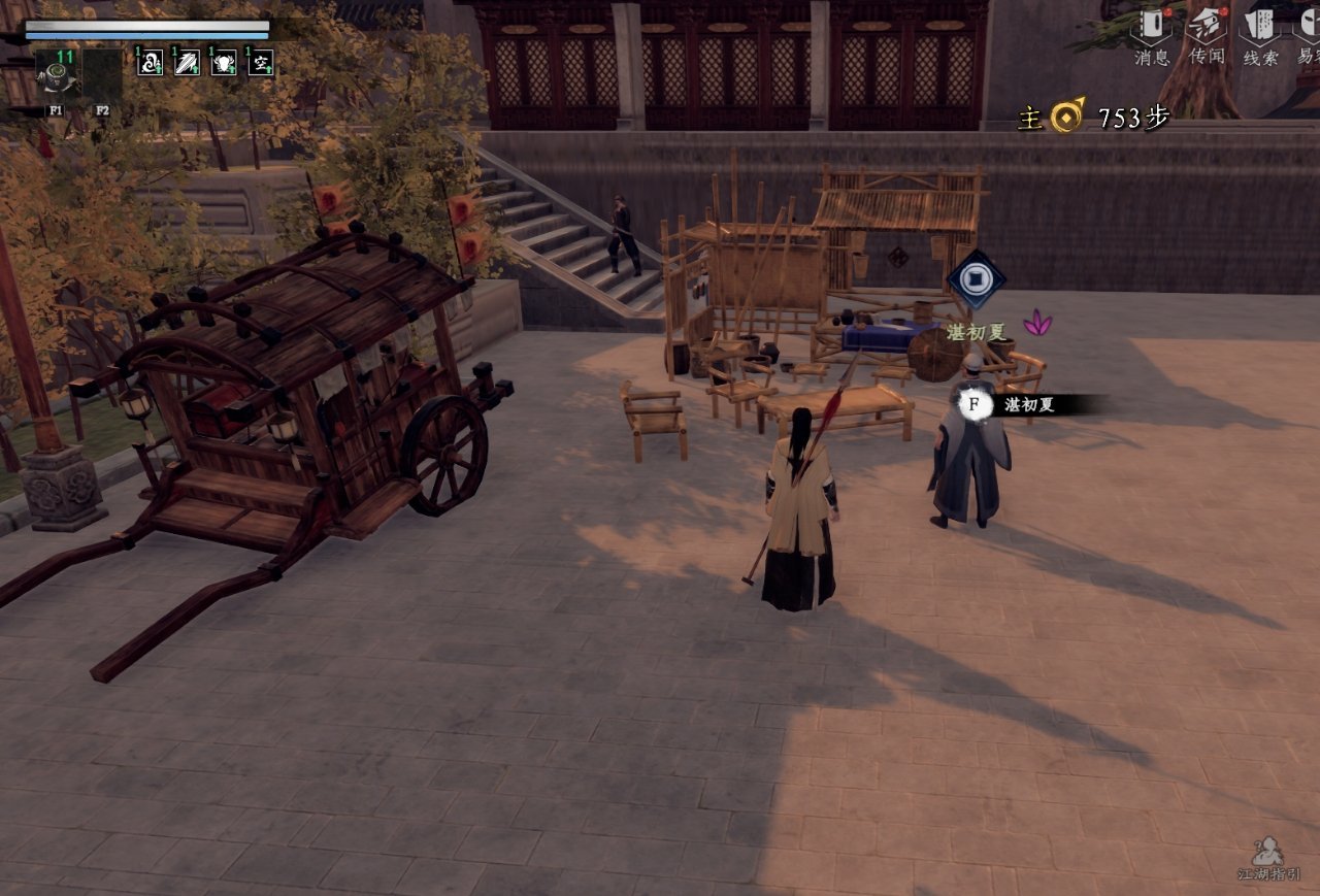 - 來到如圖所示座標(1065,1370),在這裏會遇到“陳鳴”,先不要交談,因爲解鎖了演者身份,先竊取他身上的東西(隨便竊取什麼),目的是和他交惡,當左上角出現提示時,就可以接他的委託了。