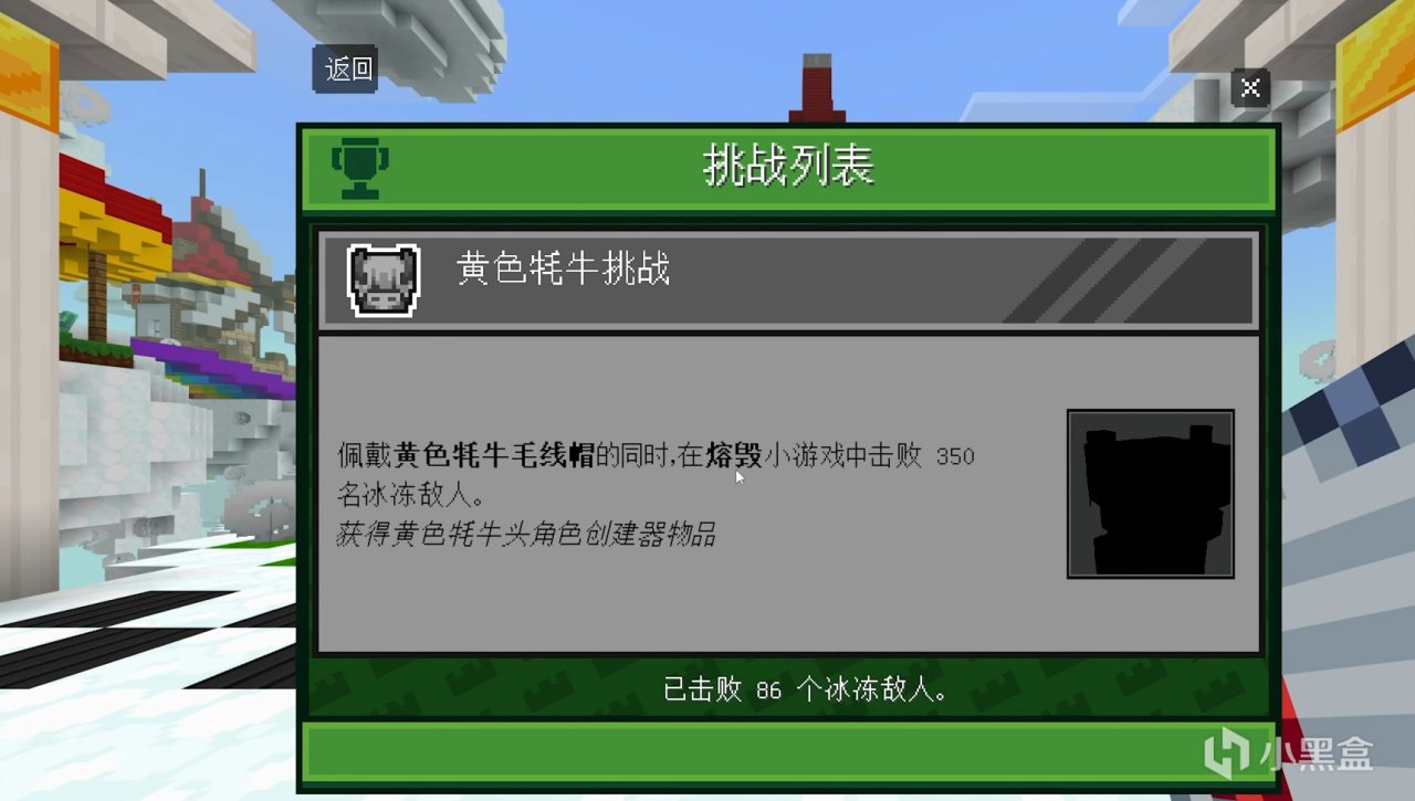 第二是遊戲的Bug,不能自定義皮膚就不說了,有時用商城上送的皮膚會在跑圖刷新時變成默認史蒂夫。第三是雖說任務不是很難,但是算比較肝的,比如說黃色犛牛挑戰:需要擊敗350名冰凍敵人。在一局中可能會擊敗40-50名左右,只需3-4局就行了。然而由於人實在是太多了,每次進入遊戲可能需要等5分鐘左右。