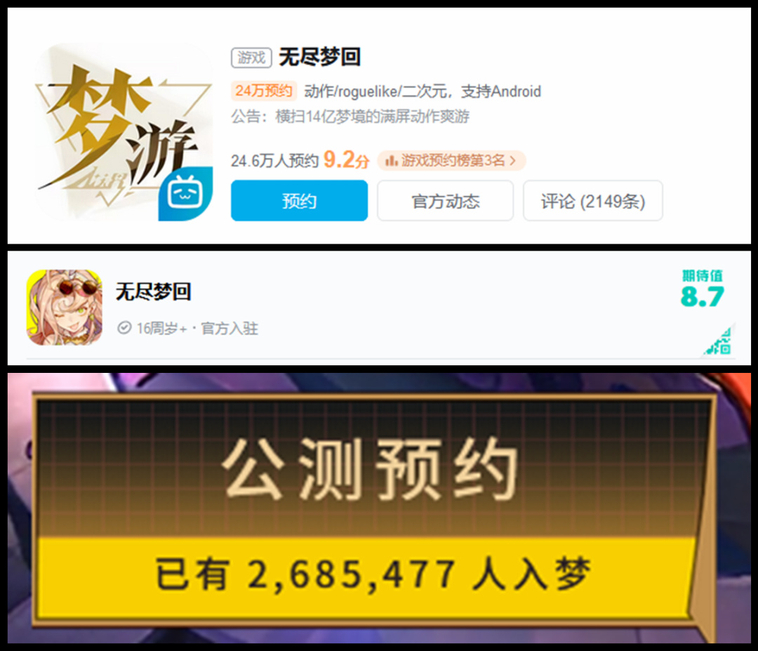 《無盡夢幻》的這套玩法邏輯,可以說是肉鴿品類的集大成者,不但BD豐富,流程也異常爽快,而且叫好又叫座,幾次測試下來,玩家反饋好評如潮,TapTap期待值8.7分,B站9.2分,全網預約近三百萬。