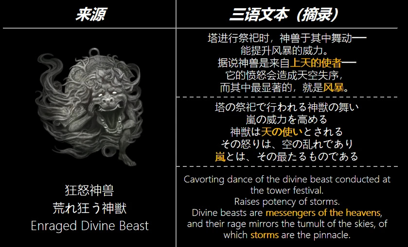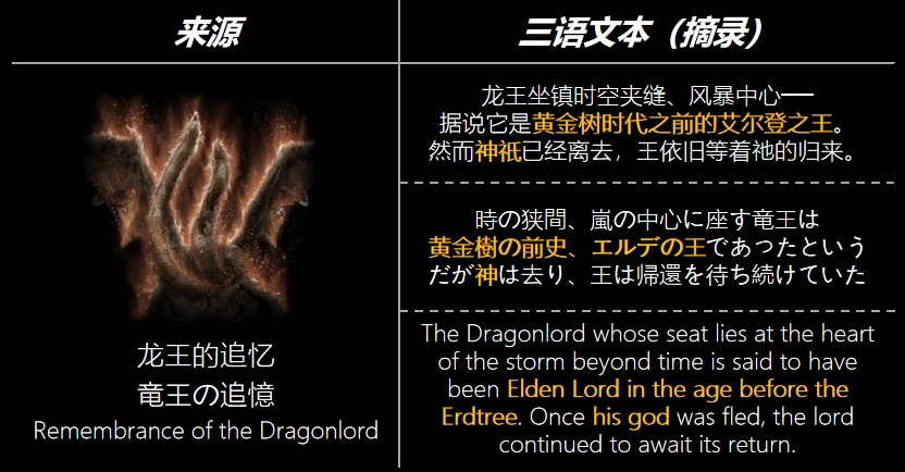 需要強調,由於古龍時代還沒有“賜福”、“神祇”或“艾爾登之王”這些名詞,這裏所使用的名詞只是爲了方便而取,古龍律法裏應該也會擁有很多特殊詞彙,但如今已經完全不可考。而後來的黃金樹文明爲了方便理解古龍文明,將古龍王稱爲黃金樹時代前的艾爾登之王