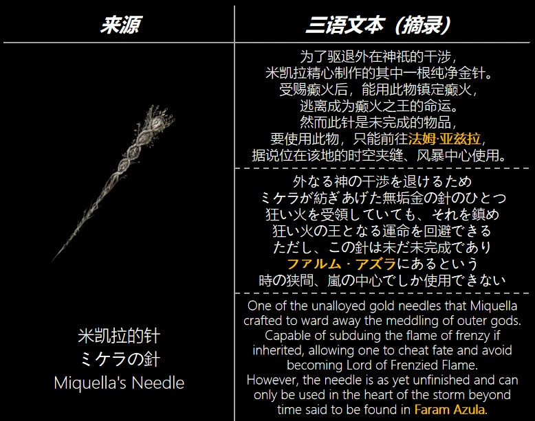 以上即是我對“法姆亞茲拉毀滅事件”的真相推斷。需要強調這只是我個人信息整理後的推論,其中,最大的線索就是癲火金針的使用方法:在法姆亞茲拉中心,才能用金針治癒癲火。