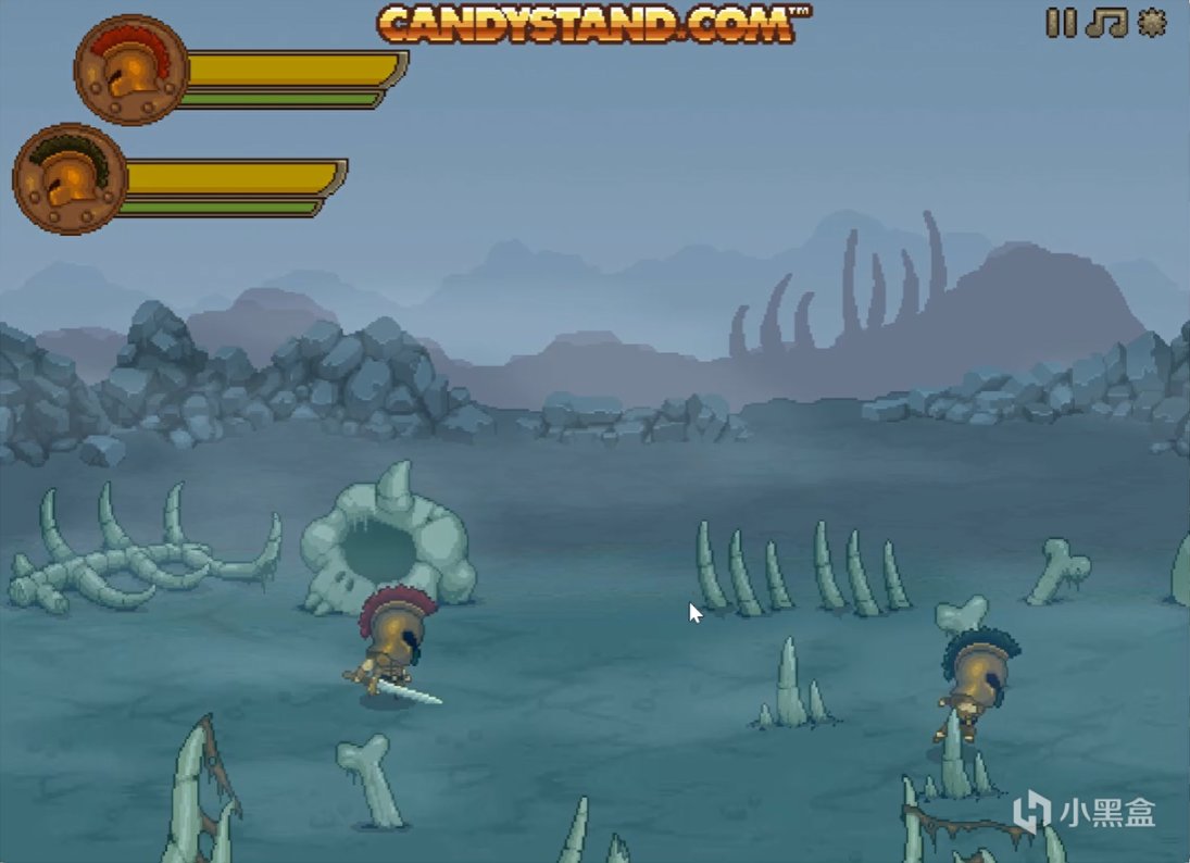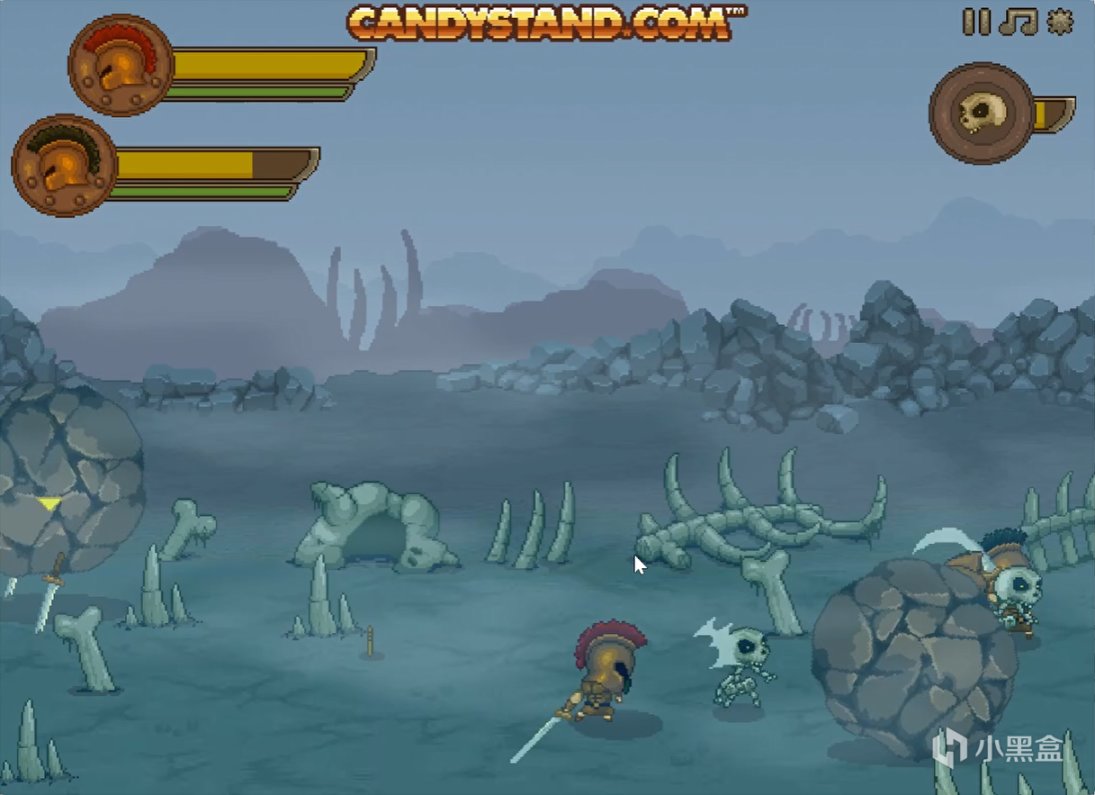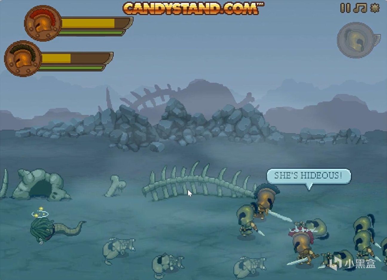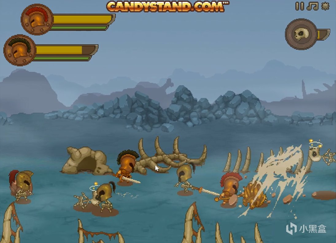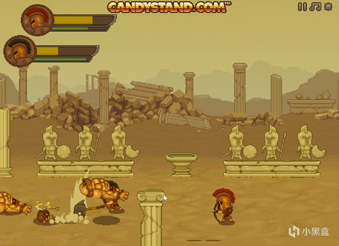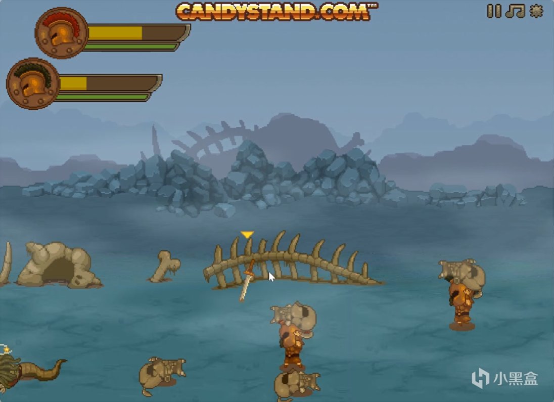 果然,不停往前走几乎不会再刷士兵了,全都是骷髅兵,他们死亡时还会带有奇怪的尖叫声。游戏里出现了与第一关相似的场景,路边出现了数不尽的石像,像极了第一关弥达斯国王的金像一样。