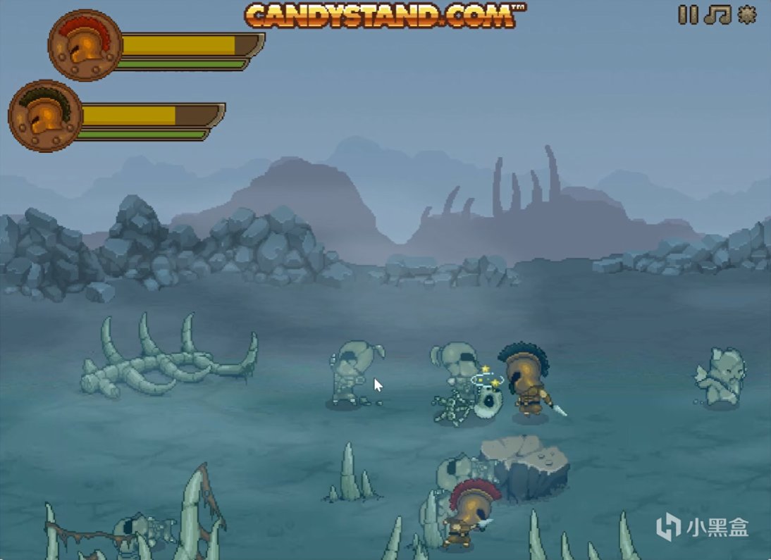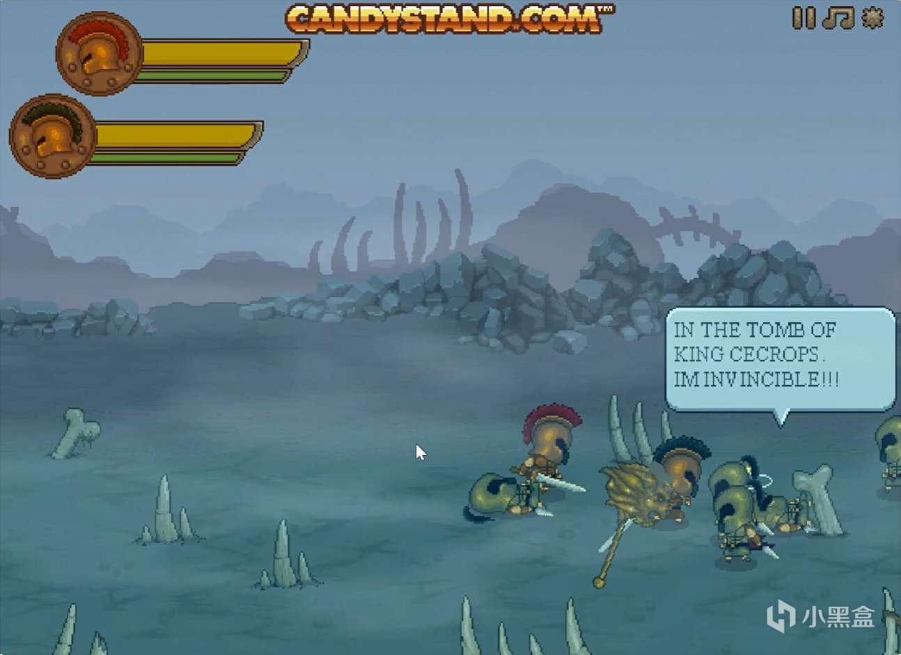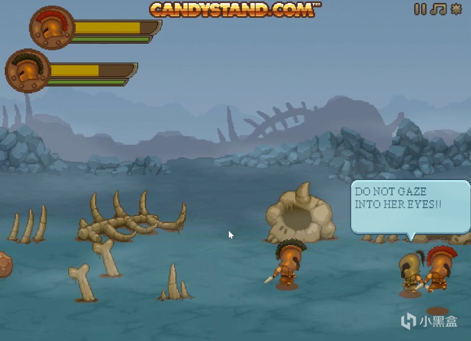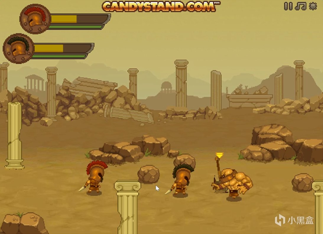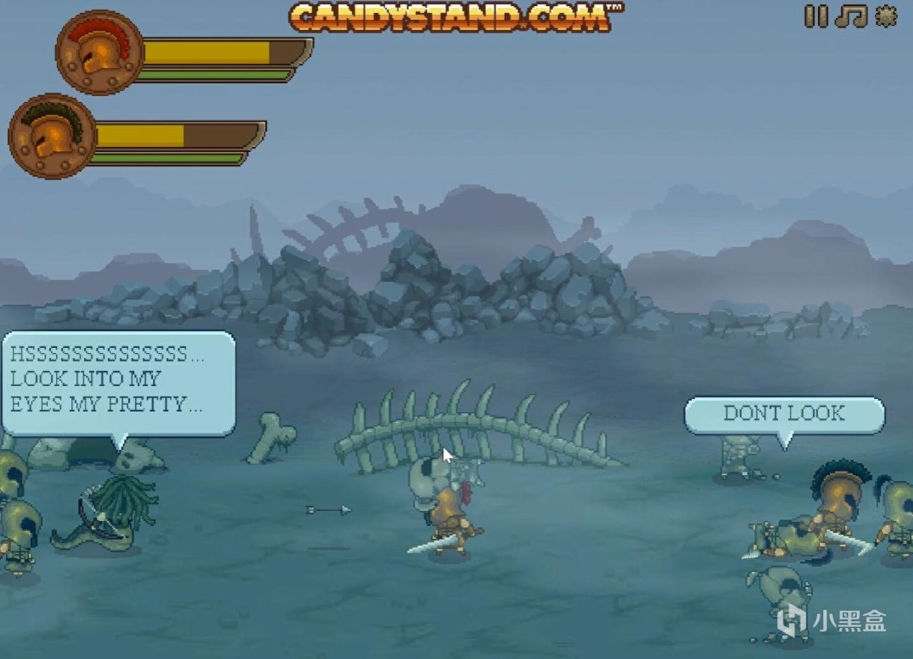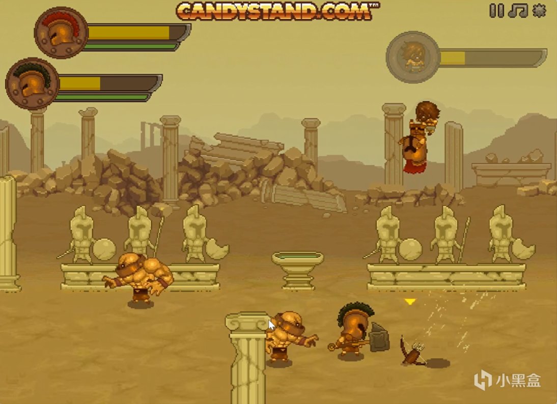 果然,不停往前走几乎不会再刷士兵了,全都是骷髅兵,他们死亡时还会带有奇怪的尖叫声。游戏里出现了与第一关相似的场景,路边出现了数不尽的石像,像极了第一关弥达斯国王的金像一样。
