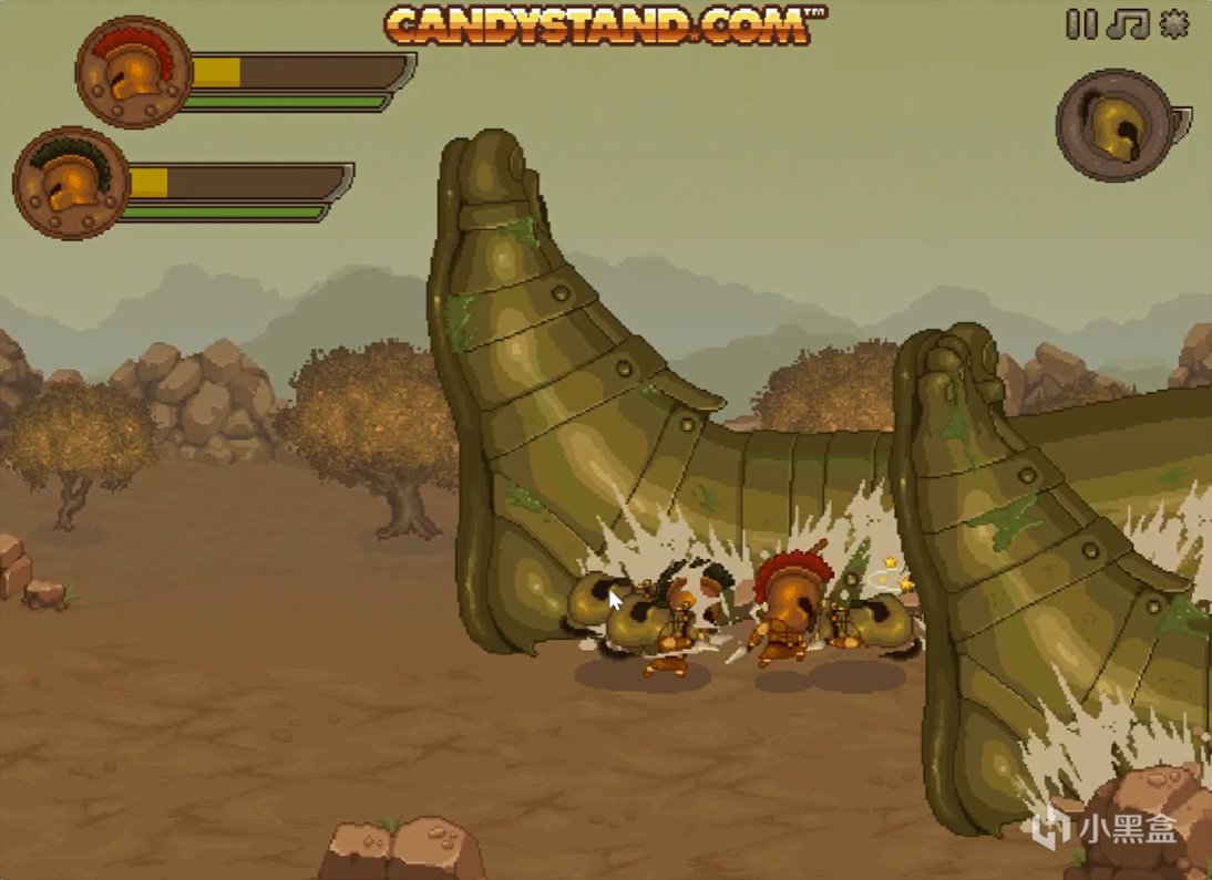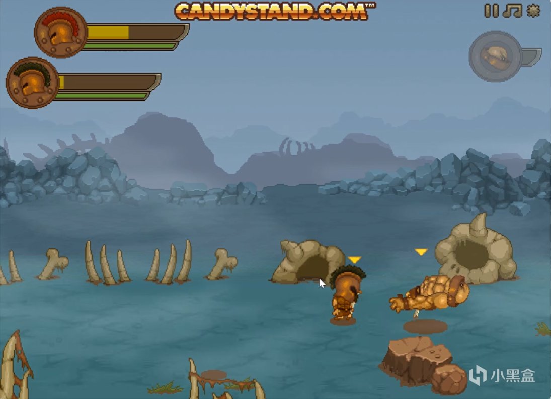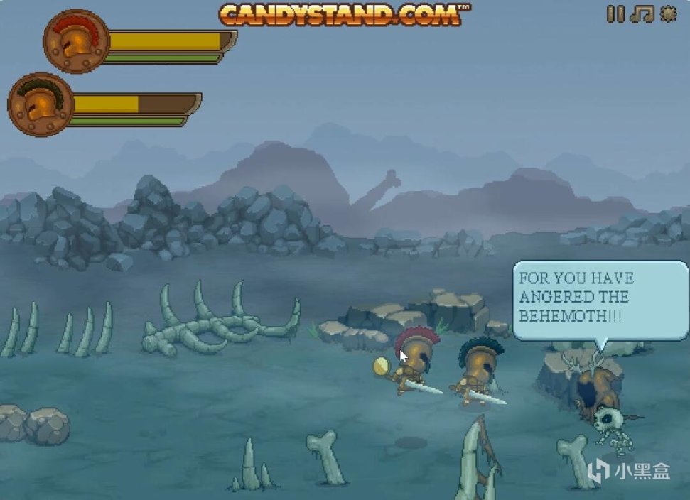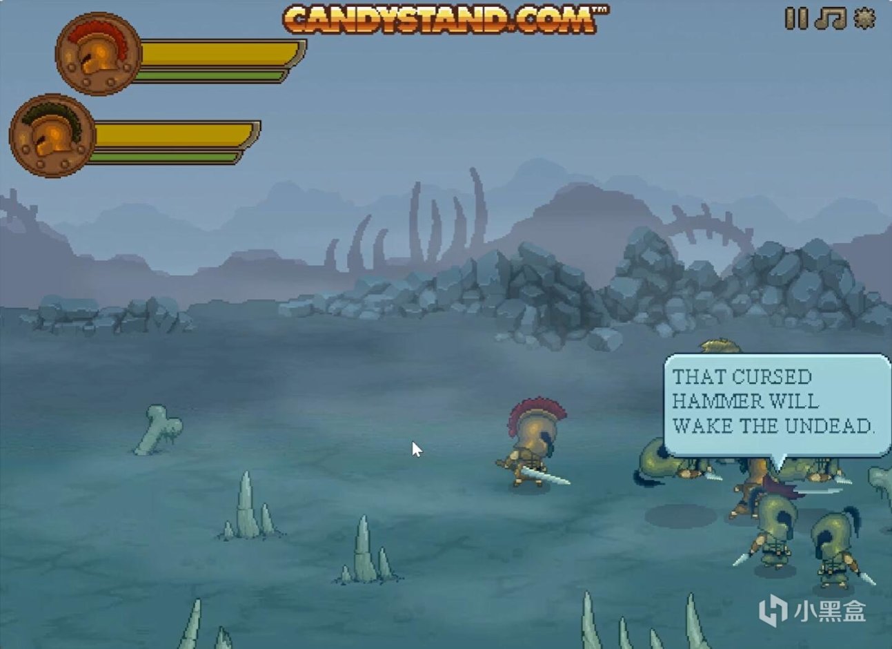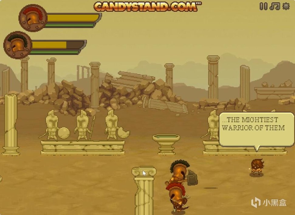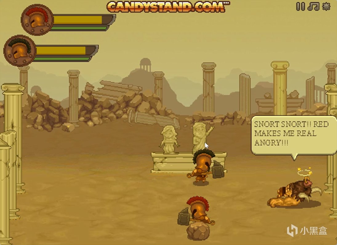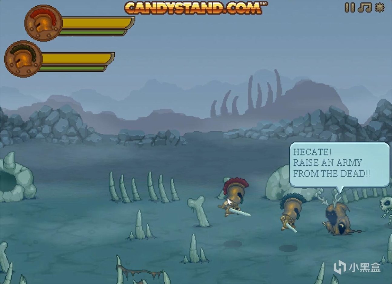果然,不停往前走几乎不会再刷士兵了,全都是骷髅兵,他们死亡时还会带有奇怪的尖叫声。游戏里出现了与第一关相似的场景,路边出现了数不尽的石像,像极了第一关弥达斯国王的金像一样。