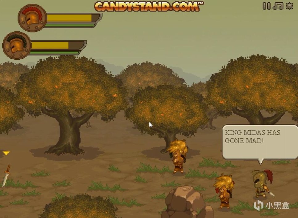 为了感谢他,我们将其干掉,继续前进。见到了本游戏的第一个boss——弥达斯国王。他的嘴里还在胡言乱语:要将王国建立在黄金的美丽之下。他的双手可以将一切东西变成黄金,我们最终通过远程攻击的方式击倒了他。
