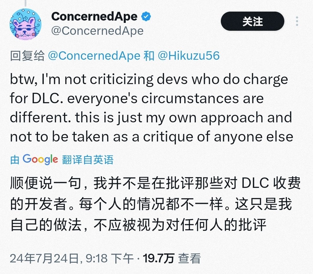 作者表示,他之前说的话并不是在批评那些DLC收费的开发者。每个人的情况不同,DLC不收费只是他个人的做法,不应被曲解为对任何人的批评。至于作者为啥补充,可能是在其他地方看到带节奏的言论了吧,免责声明总归是表明立场的。