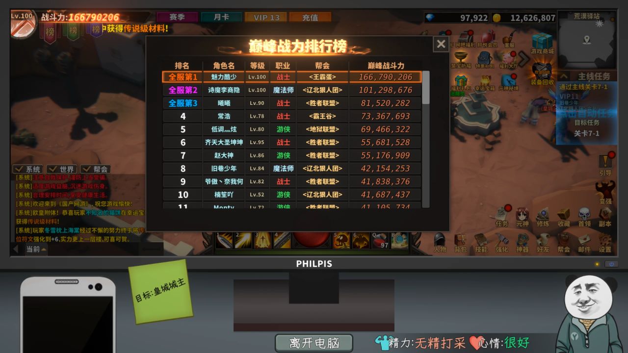 中間插播一條,當你的戰力起來之後(大概榜三左右),可以使用競技場提升心情,大概30-45分鐘一把,由於在主界面抽卡、強化等動作基本上不怎麼花費時間,其實換算下來還行;