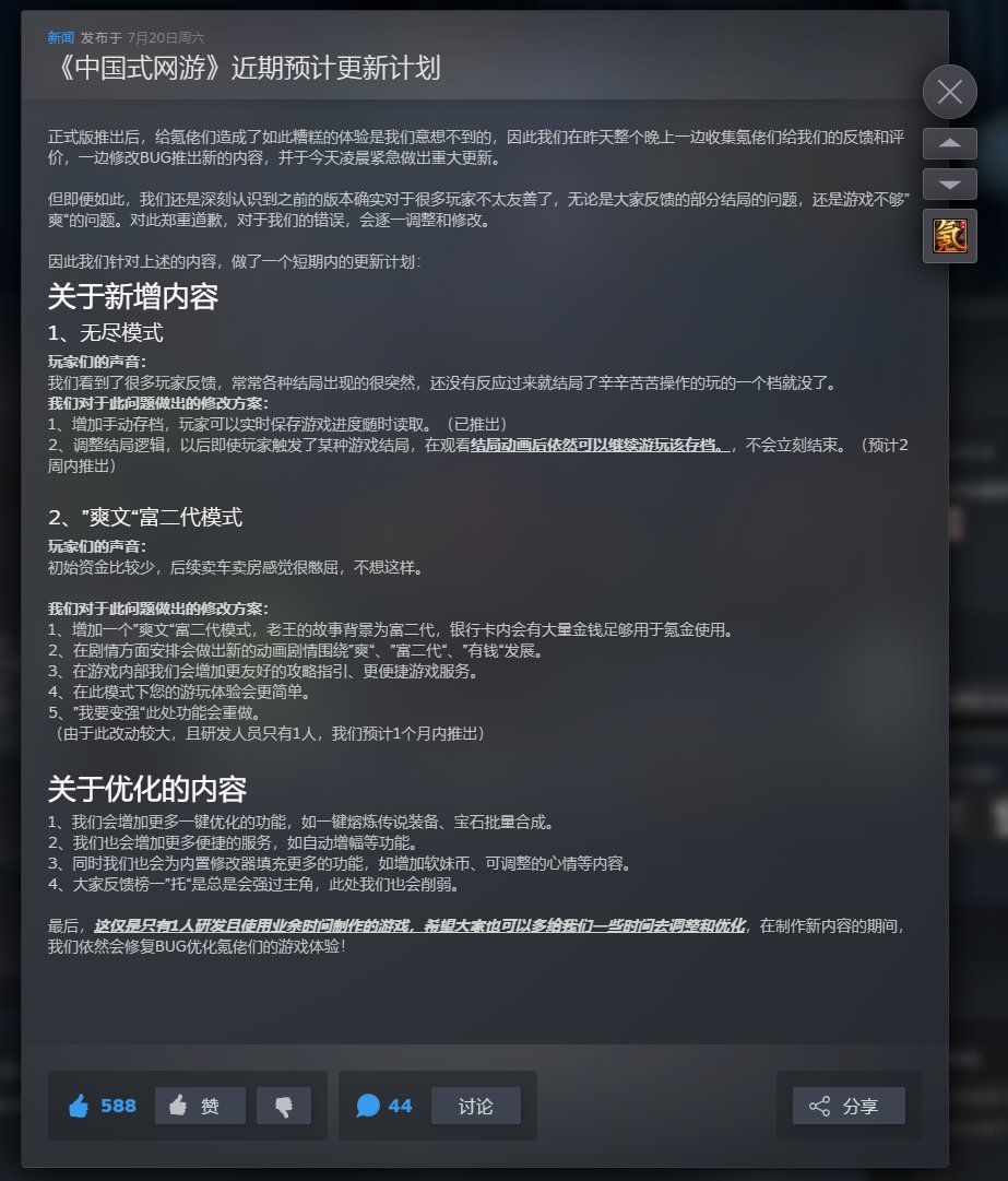 可能在遊戲內容上面《中國式網遊》需要做的還有很多,但我們濤也是一個聽勸的作者,也有在更新,作爲一個單人制作的獨立遊戲,我認爲《中國式網遊》有很多可圈可點的地方,20塊錢買不了喫虧買不了上當,純當樂子玩也不無不可。
