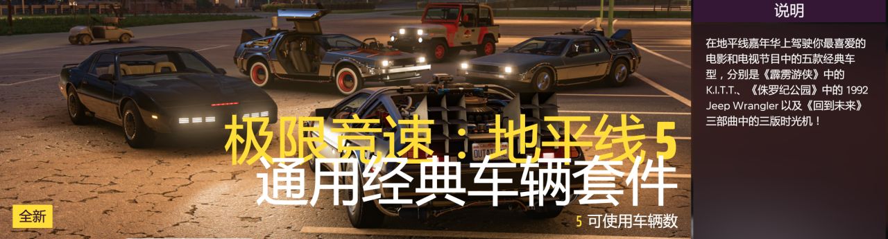 在地平線嘉年華上駕駛你最喜愛的電影和電視節目中的五款經典車型,分別是《霹靂遊俠》中的K.I.T.T.、《侏羅紀公園》中的 1992 Jeep Wrangler 以及《回到未來》三部曲中的三版時光機!