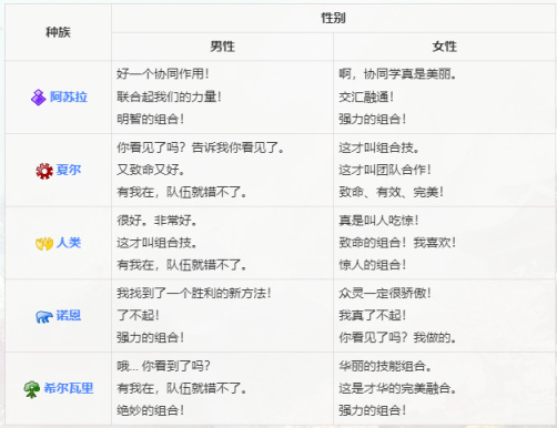 当组合技成功触发的时候,角色会说出以下列表中的一句话,说的话取决于他们的种族和性别: