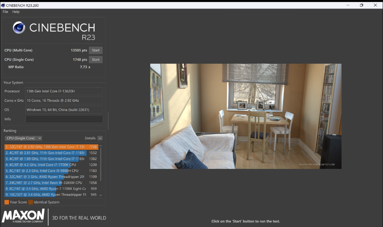▼使用R23通過3D渲染來檢驗CPU的單核、多核性能,最終得到多核13505分,單核1748分的成績。