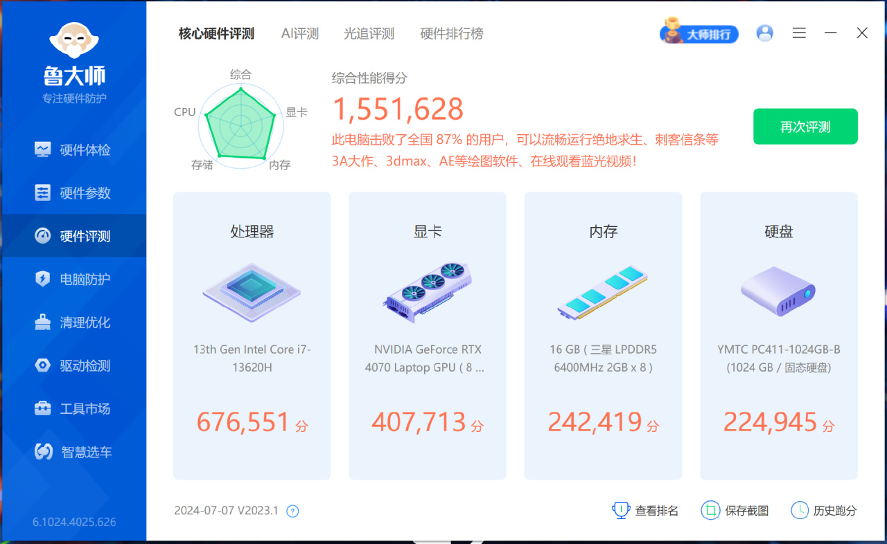 ▼用魯大師來跑一個整體分數,最終成績155.1萬分,總分上比13650HX+RTX 4060laptop GPU的組合高5萬分,顯卡分數40.7萬分再次印證了RTX 4070 laptop GPU在七彩虹源N14性能本上的性能與遊戲本滿血狀態下的RTX 4060laptop相近的測試結論。