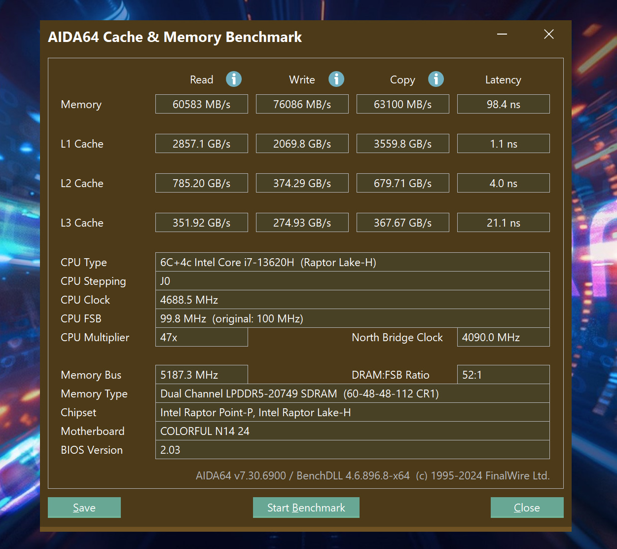▼使用AIDA64對內存進行測試,LPDDR5內存在5200MHz的頻率下運行,讀取速度60583MB/s,寫入速度76086MB/s,複製速度爲63100MB/s,延遲98.4ns,性能很強哦。