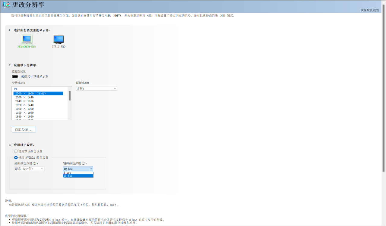 ▼使用NVIDIA控制面板進行查看,可以看到七彩虹源N14性能本AI PC搭載的屏幕支持10bit色深,默認爲8bit色深,可選分辨率爲165Hz與60Hz兩個檔位。
