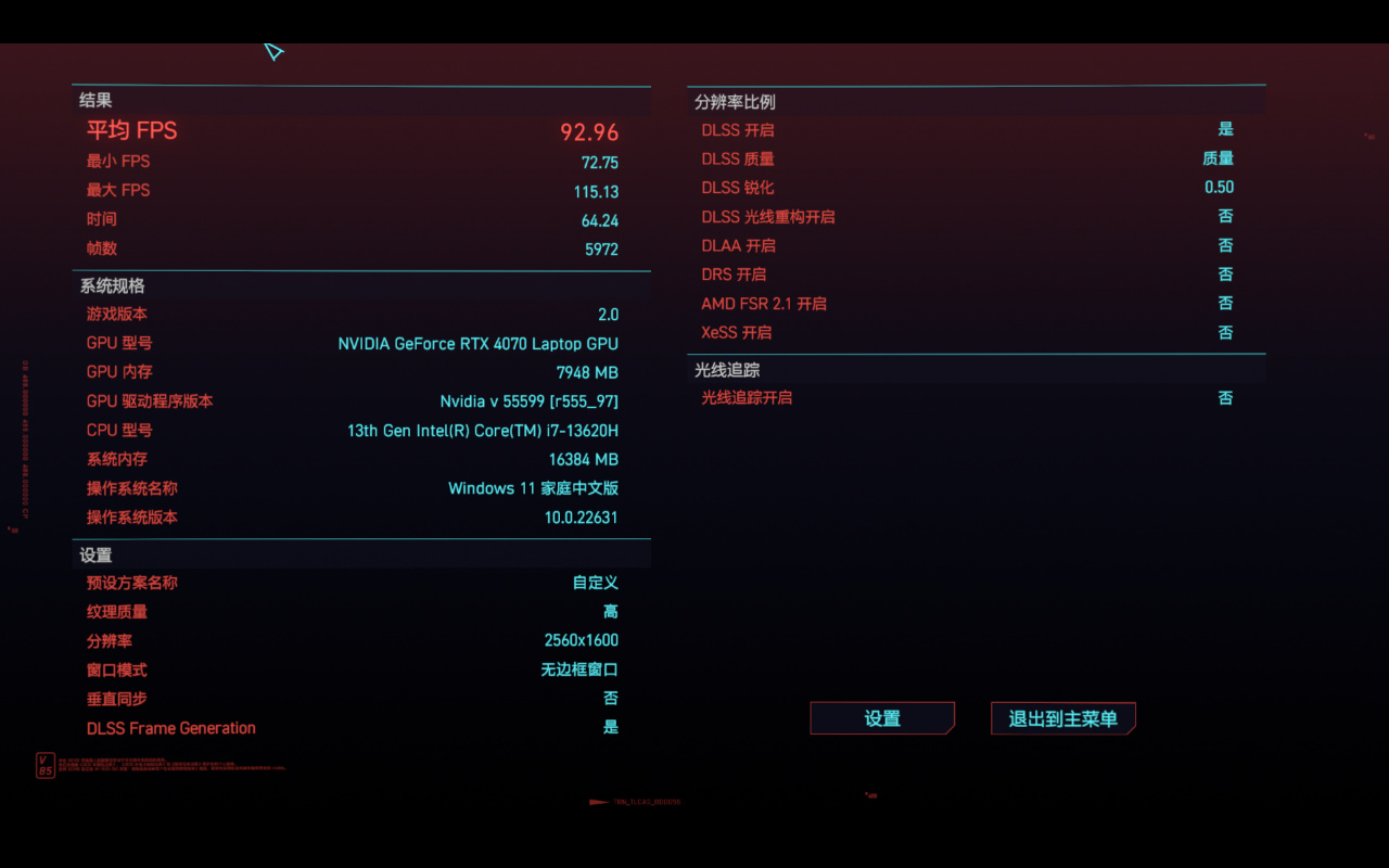 ▼全高畫質,DLSS質量,92.96幀的成績。