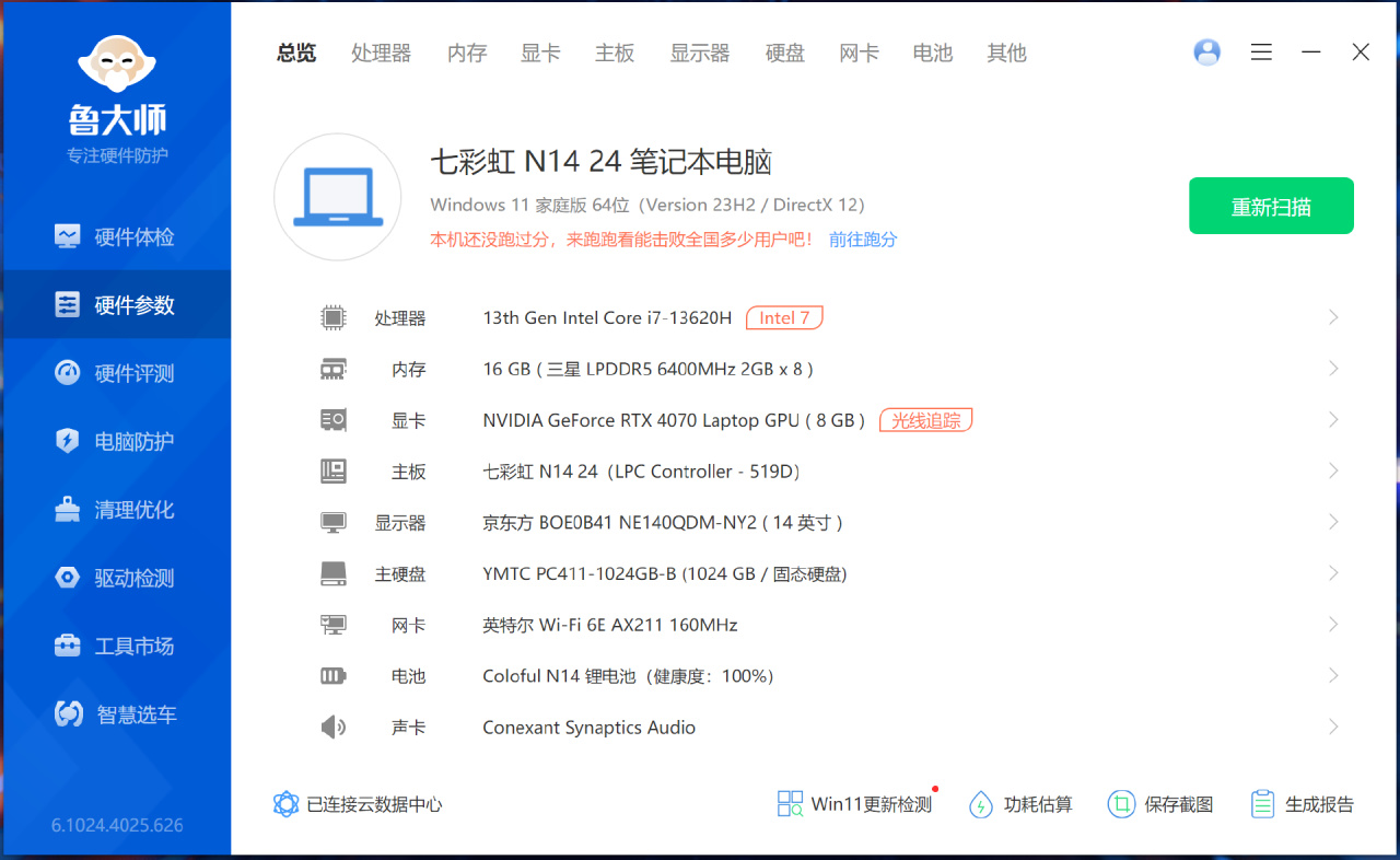 ▼先來拉去一下七彩虹 N14筆記本電腦的硬件配置,16GB板載LDPPR5內存,emm,讀取出來的數據是6400MHz,但是目前似乎是在5200MHz下運行的,七彩虹還需要努力哦,屏幕面板來自京東方,搭載AX211 WiFi 6E無線網卡。