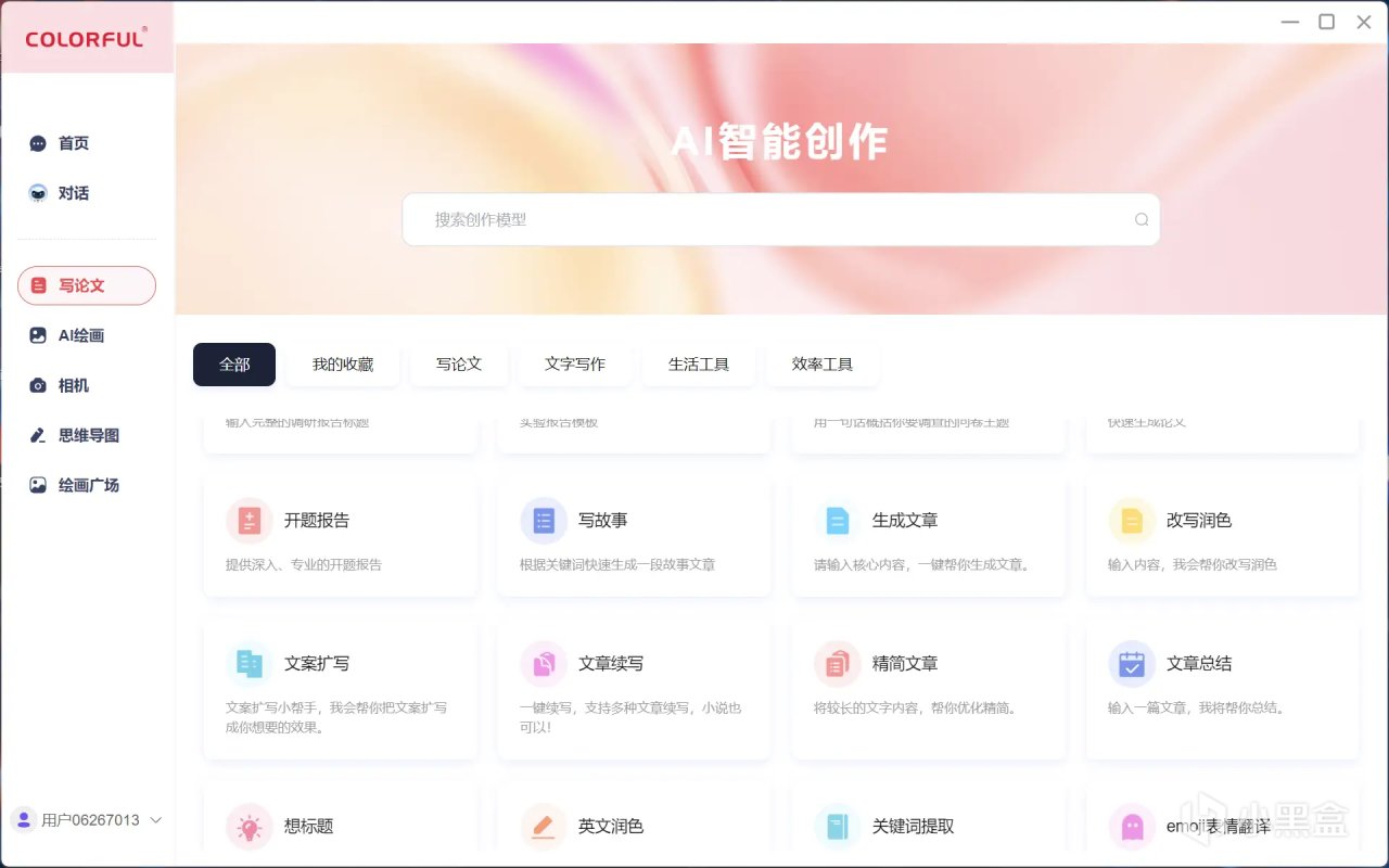 ▼程序將常用的AI功能進行了分類,提供了AI文字創作、AI繪畫、AI相機、思維導圖等功能。