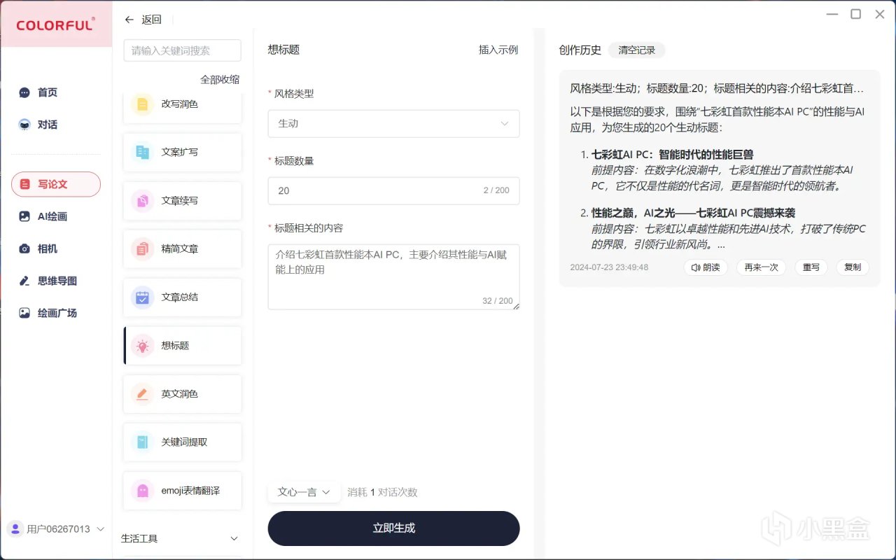 ▼寫七彩虹【源N14】性能本想不到一個好標題?沒關係,讓虹光AI來幫忙,支持文心一言與訊飛星火3.0。