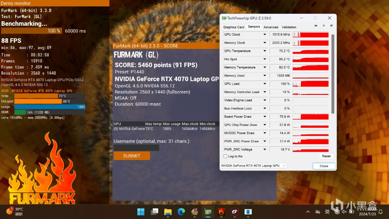▼想來對於源N14 性能本 AI PC 大家都很關心其散熱性能,我這裏就把FurMark烤顯卡放在最前面,壓力測試時長3分鐘,測試分辨率1440P,筆記本在性能模式、風險爲標準模式下運行(畢竟),最終測得最小頻率1456MHz,最大頻率1606MHz,GPU溫度溫度在73℃左右,熱點80.2℃,顯存溫度92℃,顯卡實時功耗75W,顯卡芯片功耗57.6W。