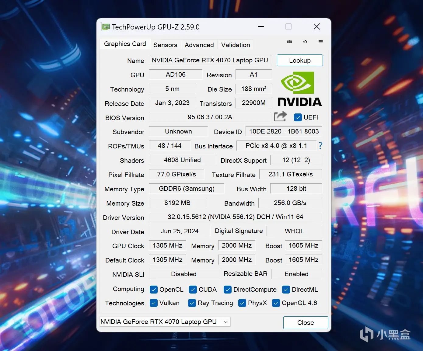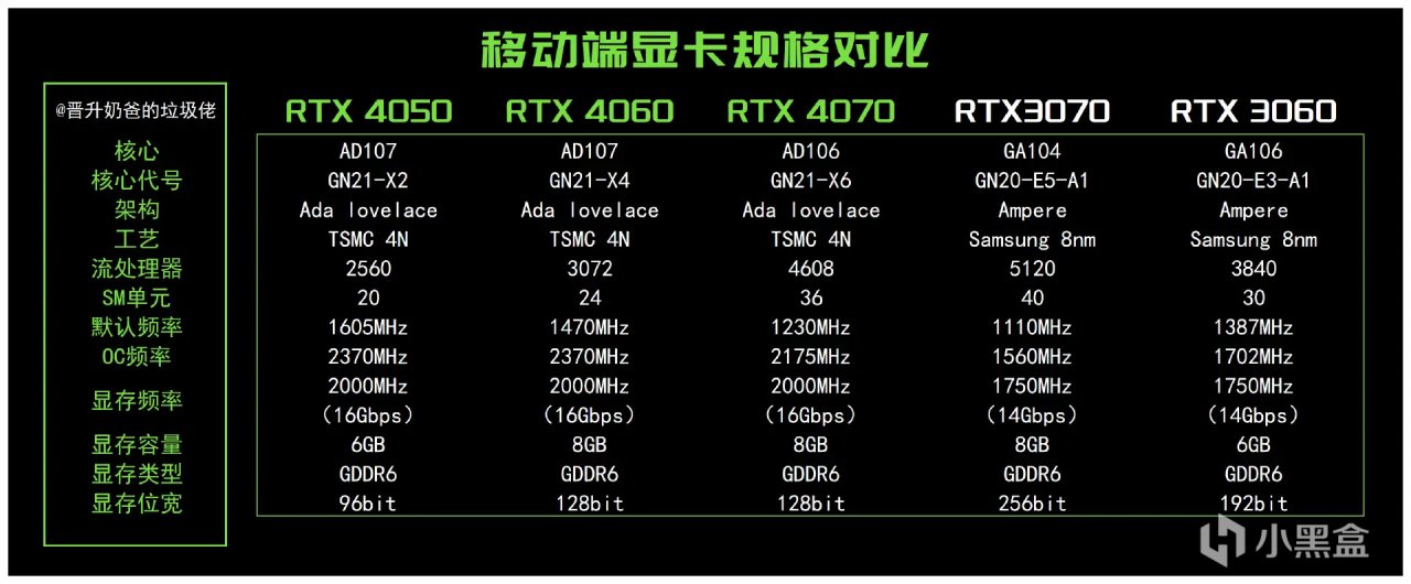 ▼RTX 4070 筆記本電腦 GPU使用AD106核心,包含完整的36組SM單元,4608個流處理器,默認頻率1230MHz,Boost頻率2175MHz,顯存位寬同樣爲128bit,顯存容量也依舊是8GB。RTX 40系移動端GPU相較30系同級別核心規模小了不少,也因此相較RTX 30系顯卡【省電】不少,顯卡性能的提升則主要來自於頻率的提高,RTX 4070 Boost頻率2175MHz,而RTX 3070 CO只能到1560MHz,臺積電4nm工藝YYDS。