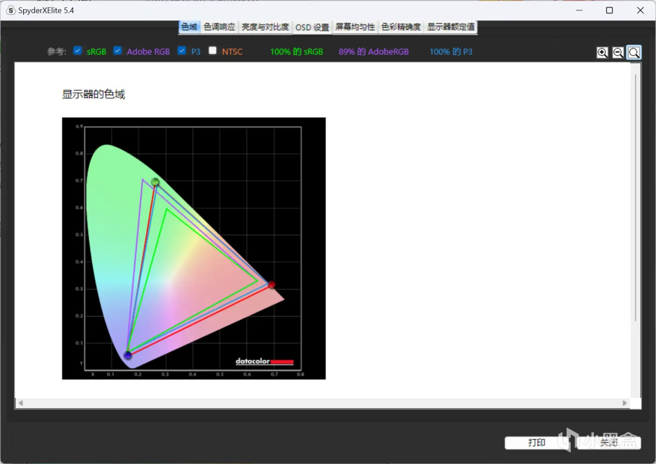 ▼拉出來紅蜘蛛實際測試一下,首先是色域測試,最終測得100% sRGB、89% AdobeRGB、100% DCI-P3,色域覆蓋效果相當出衆。
