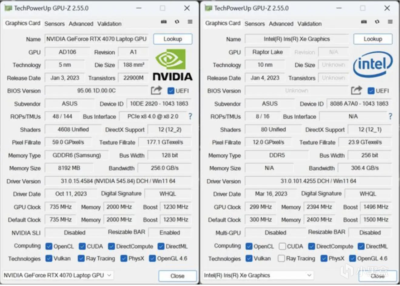 ▼懷着強烈的好奇心,我也搜索了一下其他家高性能獨顯輕薄本的boost頻率,華碩靈耀14Pro上搭載的RTX 4070 筆記本電腦 GPU給到的Boost頻率爲1230MHz,看樣子全能本“不滿血”這件事各大廠之間是能達成共識的。