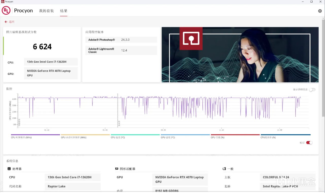 ▼同時我還測試了照片編輯基準測試,畢竟adobe全家桶已經支持AI功能,對於我這個圖文創作者來說,ai降噪已經成爲生產工序中不可或缺的環節,最終獲得了6624的成績。