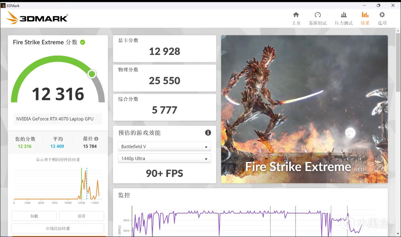 ▼Fire Strike Extreme分數12316分,顯卡分數12928分,與滿功耗RTX 4060也幾乎沒有什麼差異。
