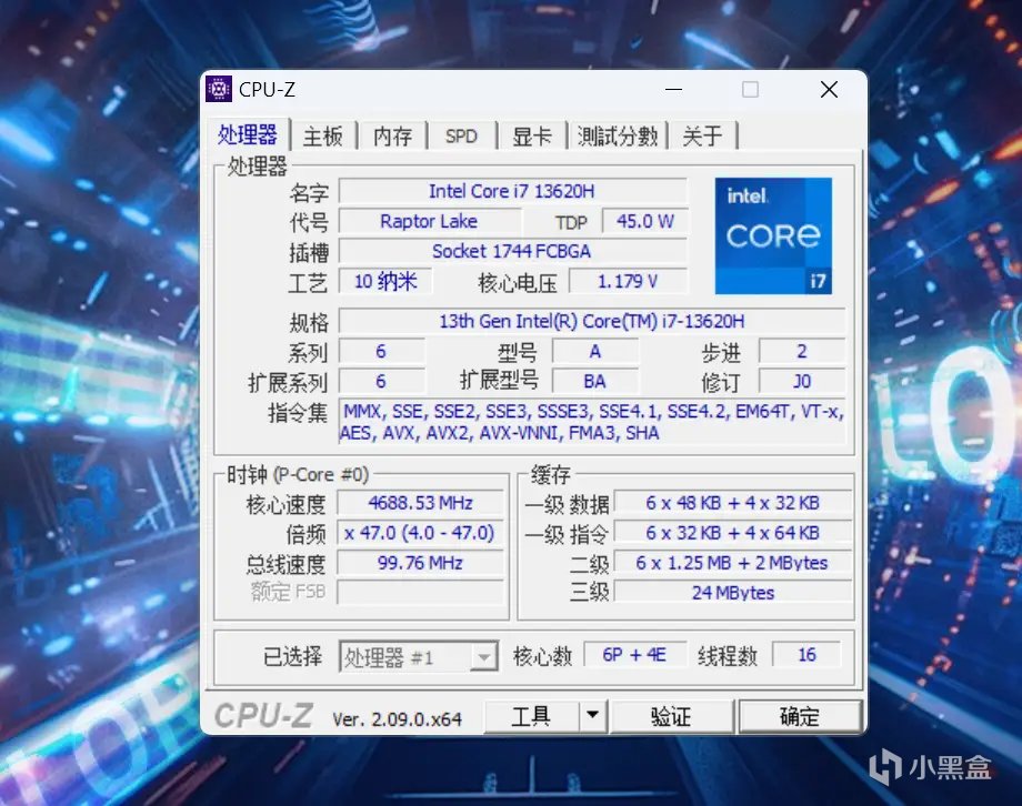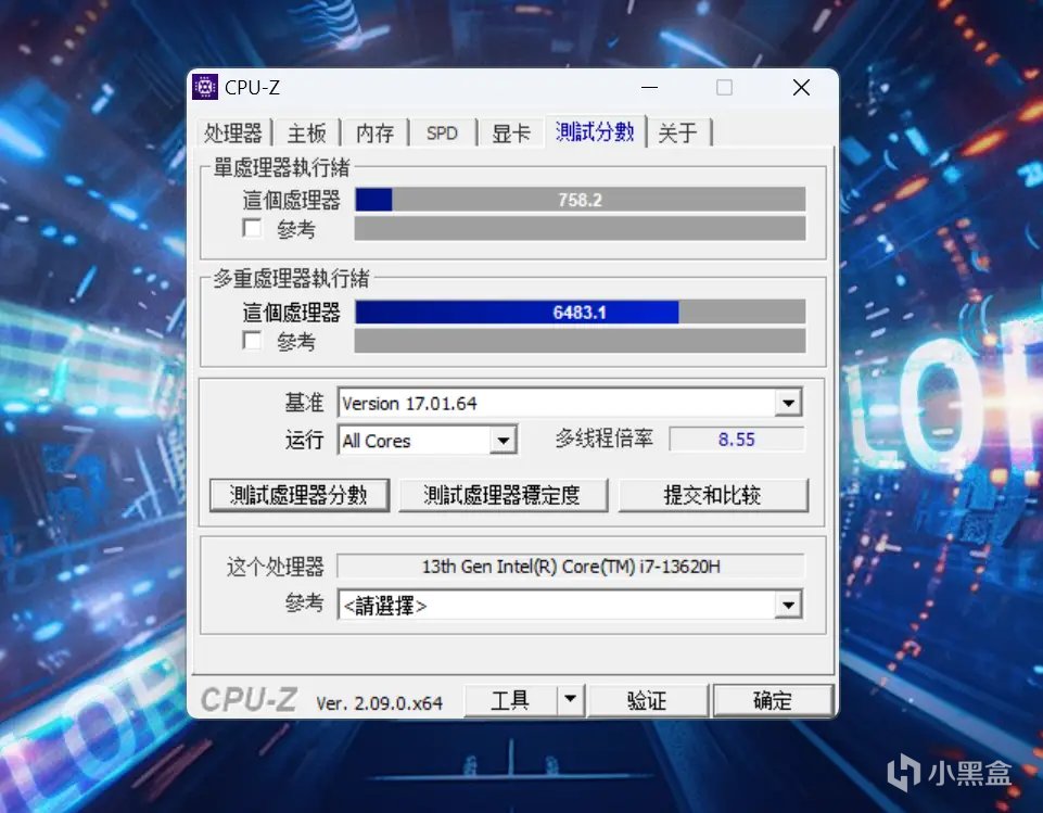 ▼使用CPU-Z對處理器性能進行簡單的跑分,最終得出單核成績爲758.2,多核成績爲6409,單核性能與13650HX相差3%左右,多核性能相差25%左右,畢竟既要兼顧性能又要兼顧續航,13620H是一個非常不錯的選擇。