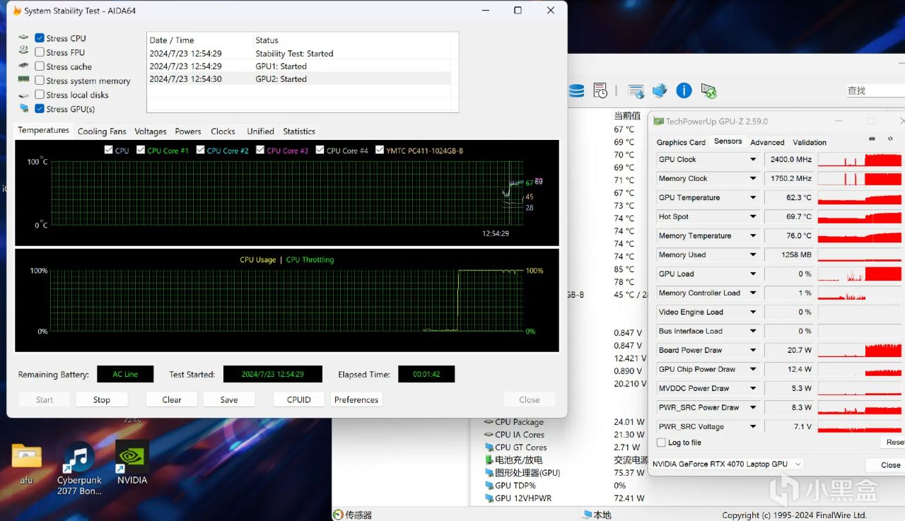 ▼使用AIDA 64進行CPU、GPU烤機,肉眼觀測RTX 4070頻率最高能到2400MHz,風扇滿載的情況下顯卡溫度在74℃左右,顯卡實時功耗在75W左右(看AIDA 64),CPU功耗在25W左右,整機功耗大致剛好在100W左右,策略爲優先顯卡供電,正常使用場景下筆記本電腦很難達到這樣的極限負載情況,放心用就好啦。至於AIDA 64與Furmark壓力測試出來的GPU頻率不同,主要是因爲測試的負載模式與算法不同,導致GPU頻率表現有所差異,RTX 4070 laptop GPU的上限還是蠻高的。